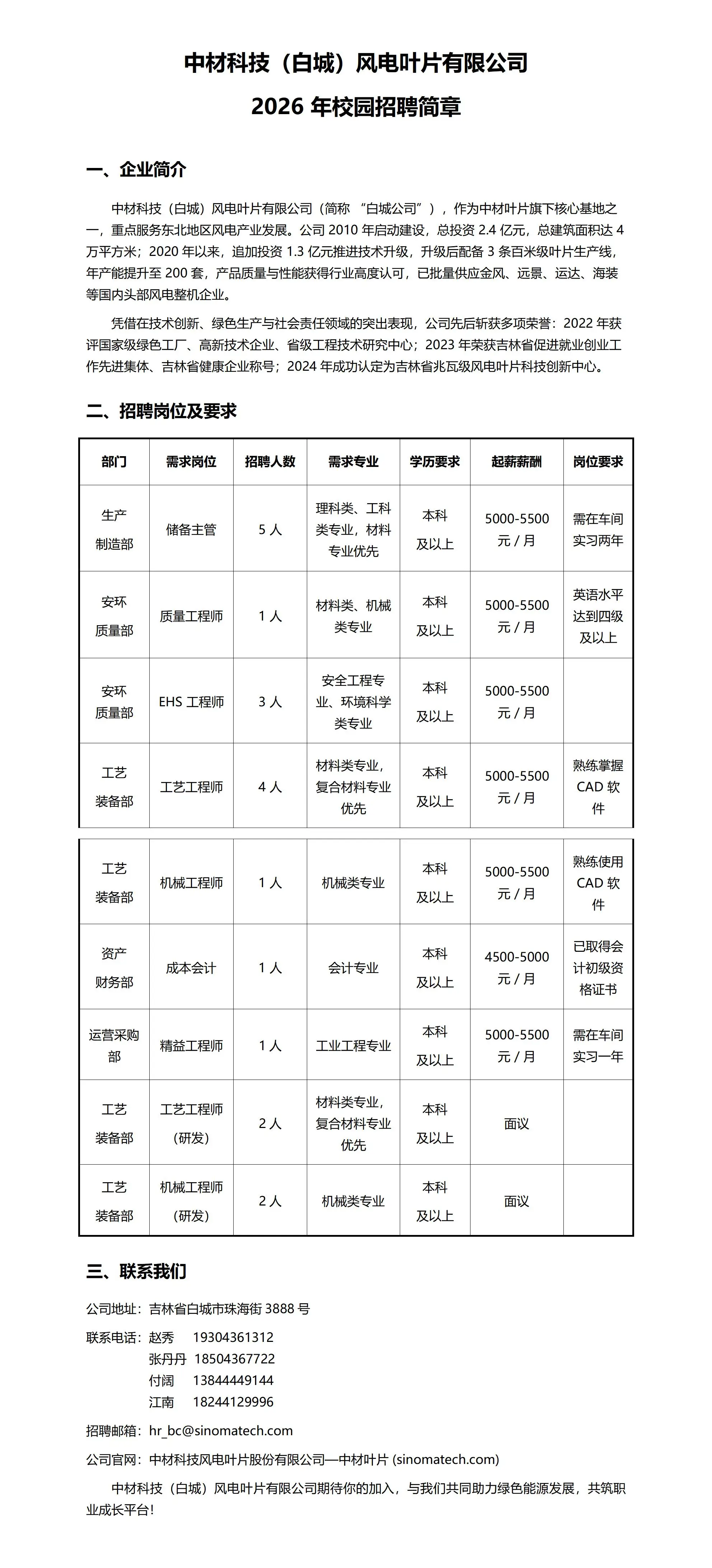 中材科技(白城)风电叶片有限公司 2026 年校园招聘简章